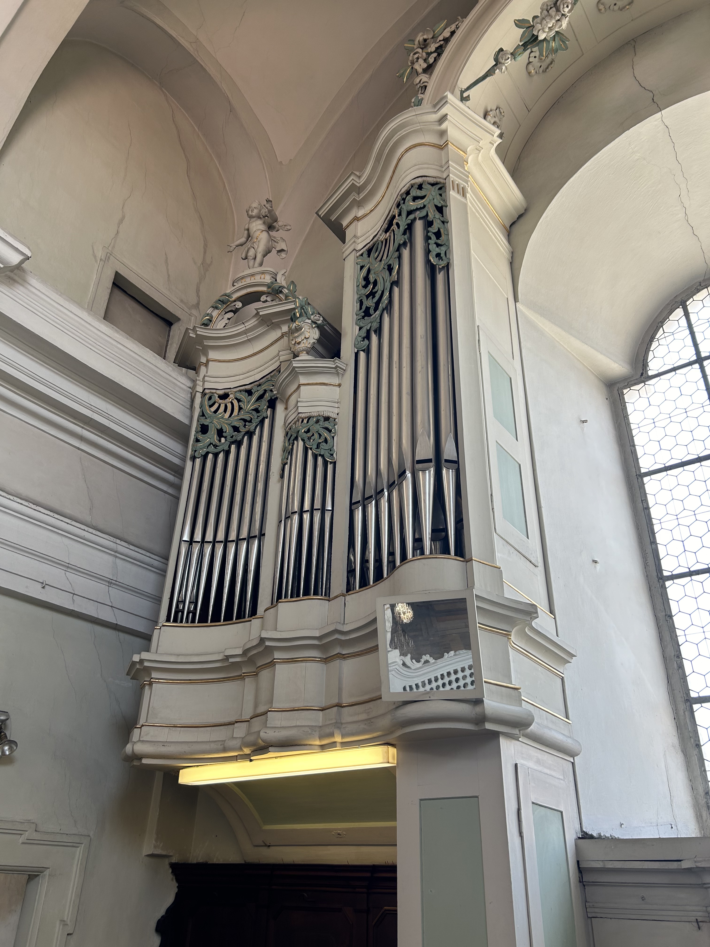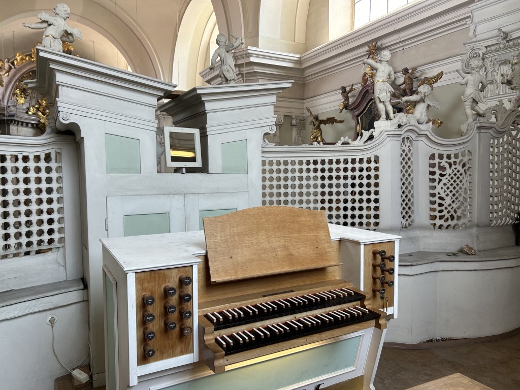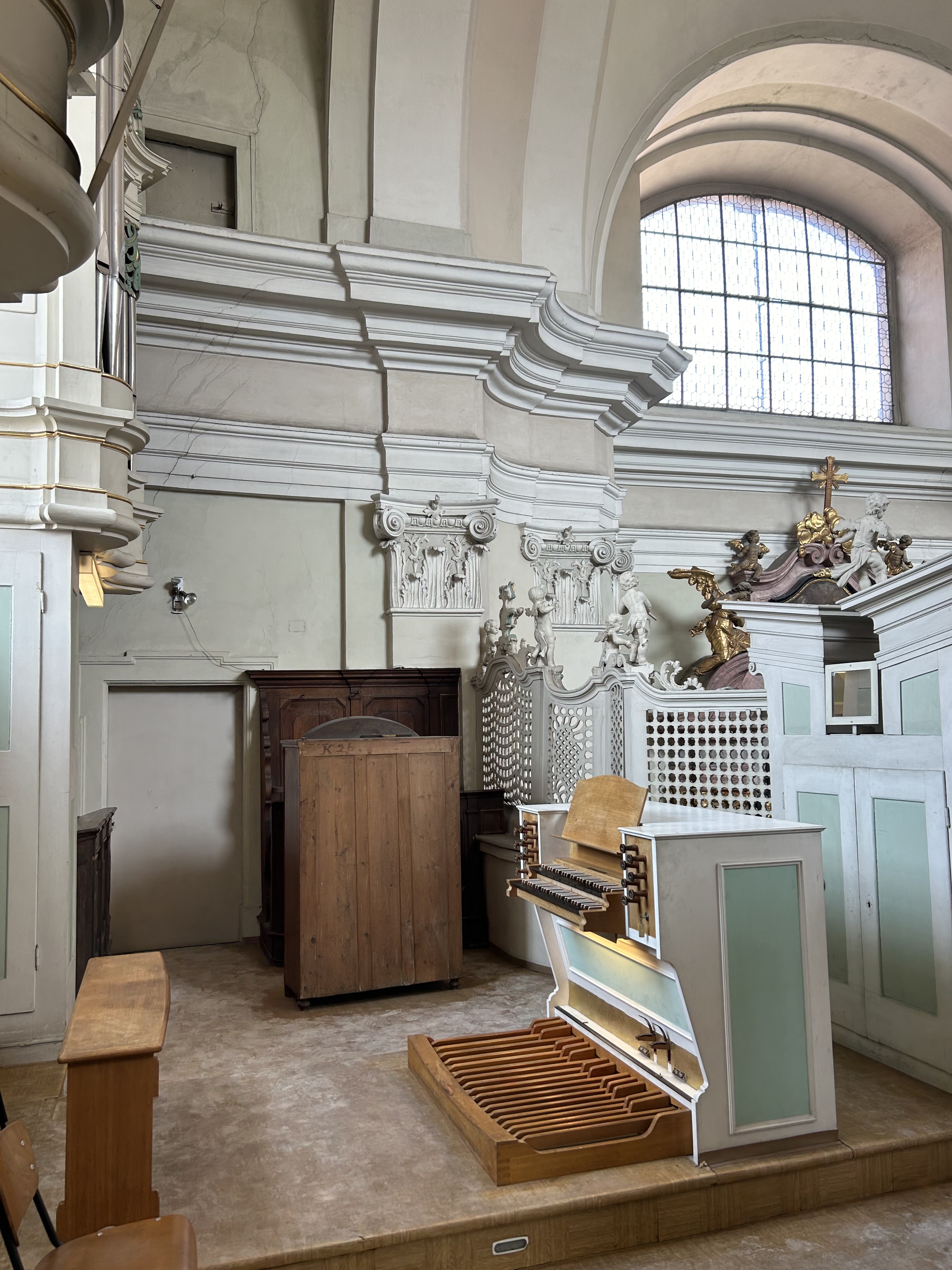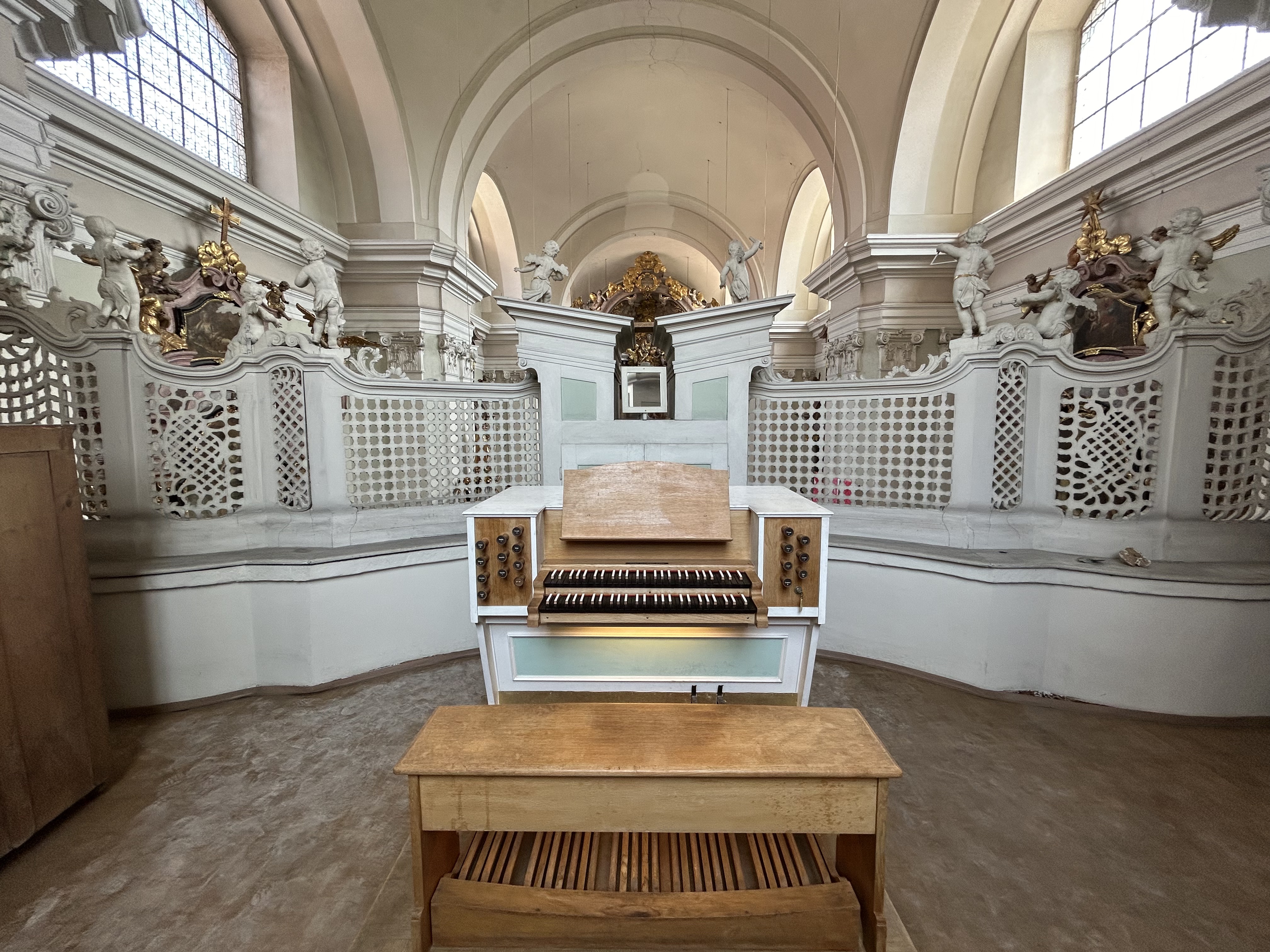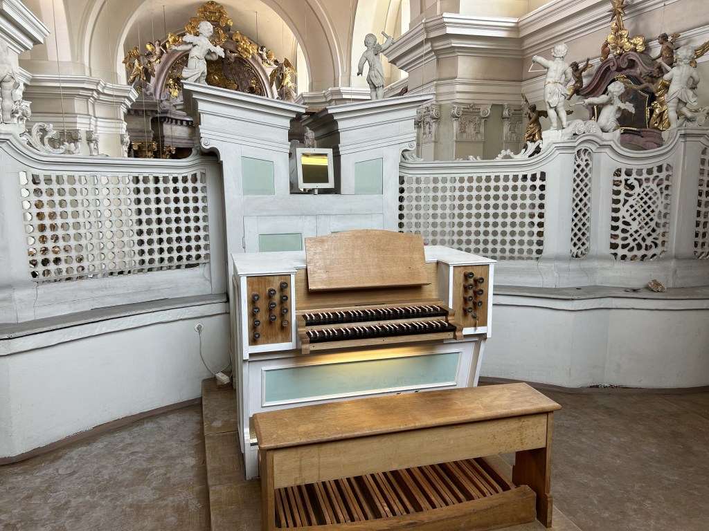 „Der Erbauer der d. ursprünglichen Barockorgel m. 14 klingenden Registern, ist nicht bekannt. Sie wurde 1945 durch Kriegs- u. Nachkriegsereignisse zerstört.“