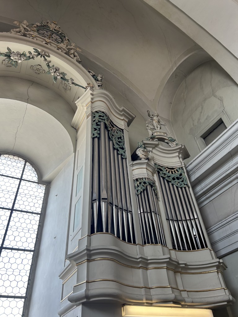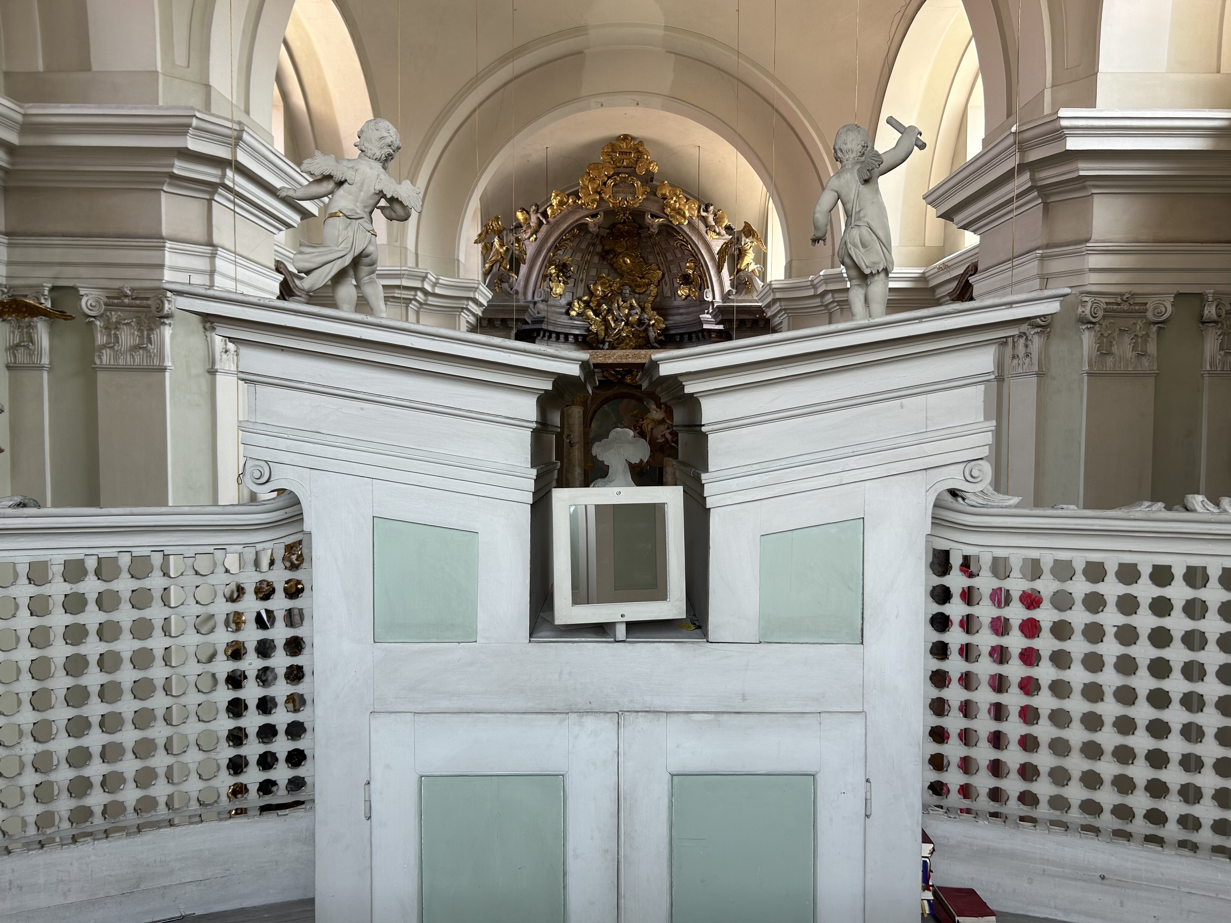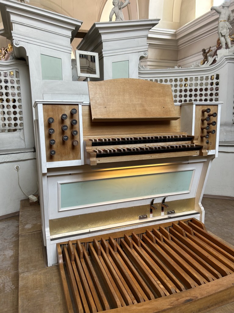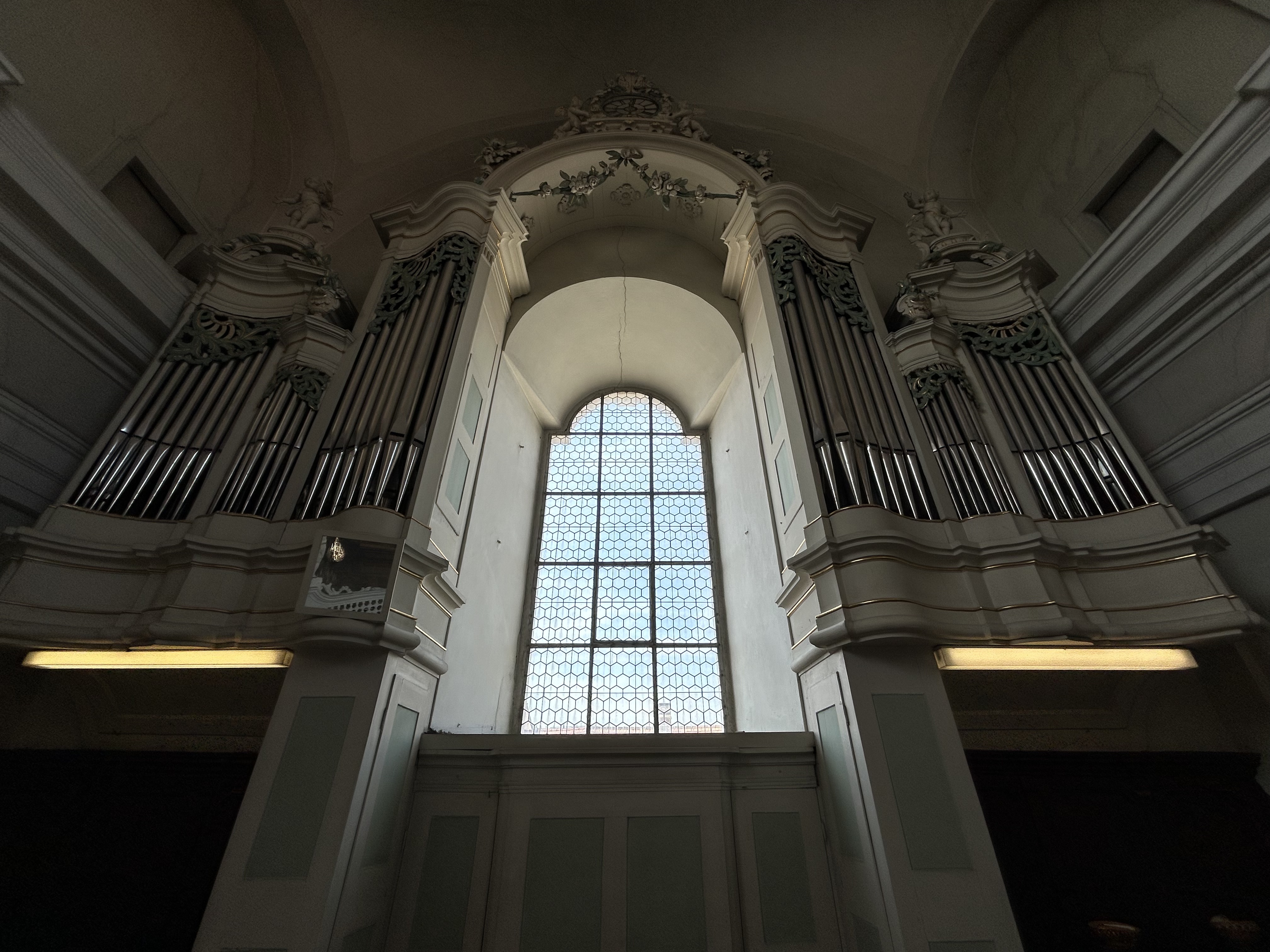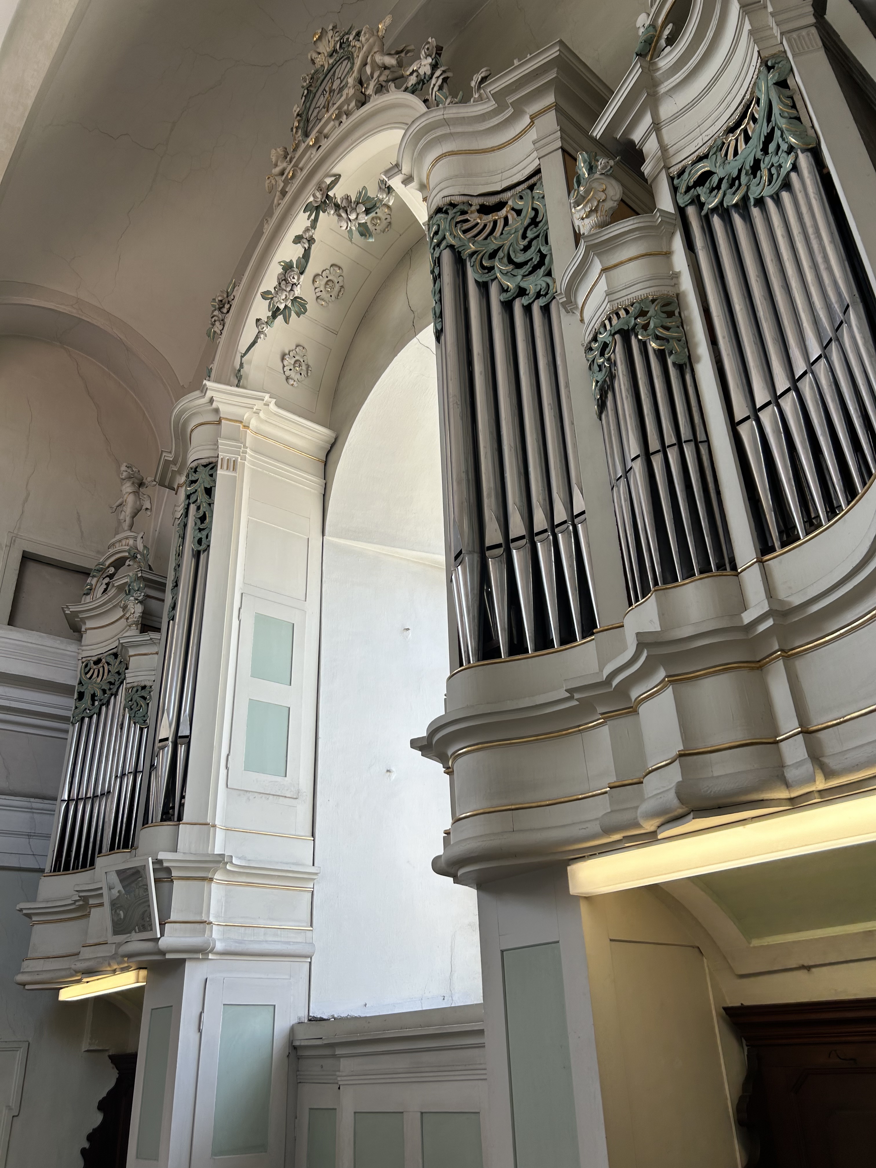 „Der Erbauer der d. ursprünglichen Barockorgel m. 14 klingenden Registern, ist nicht bekannt. Sie wurde 1945 durch Kriegs- u. Nachkriegsereignisse zerstört.“