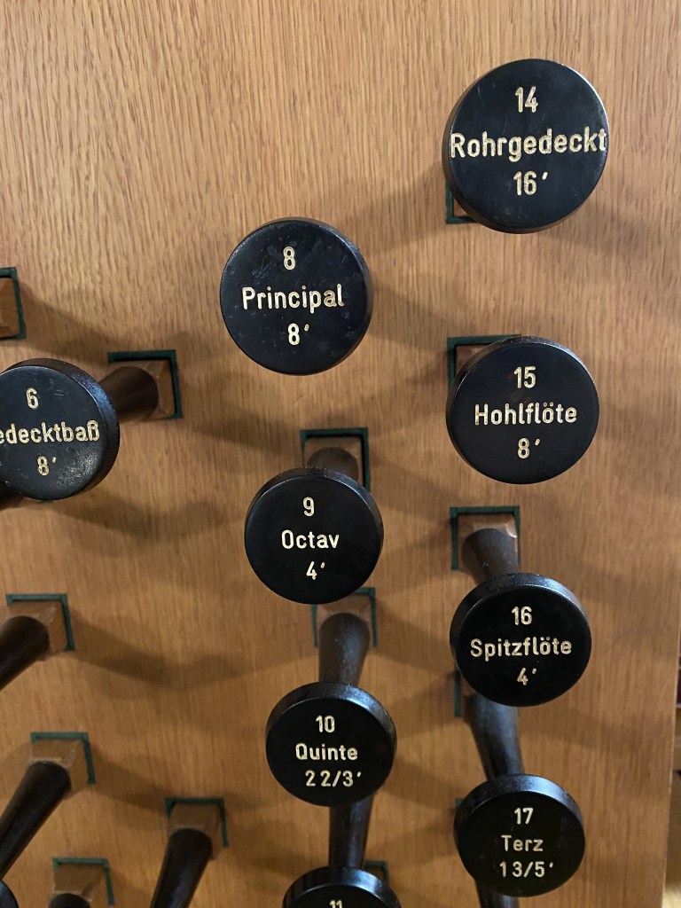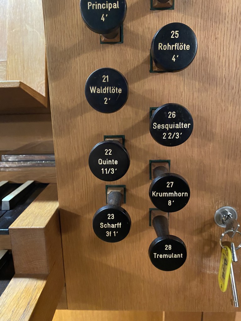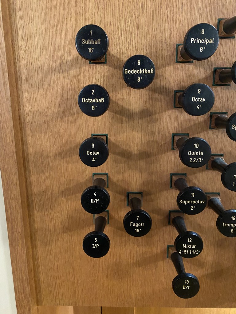 HB 2: P: Subbaß 16′, Gedecktbaß 8′, I: Principal 8′, Hohlflöte 8′ II: Spitzgamba 8′, Gedackt 8′, S: Koppel I/P, … + II Krummhorn 8′